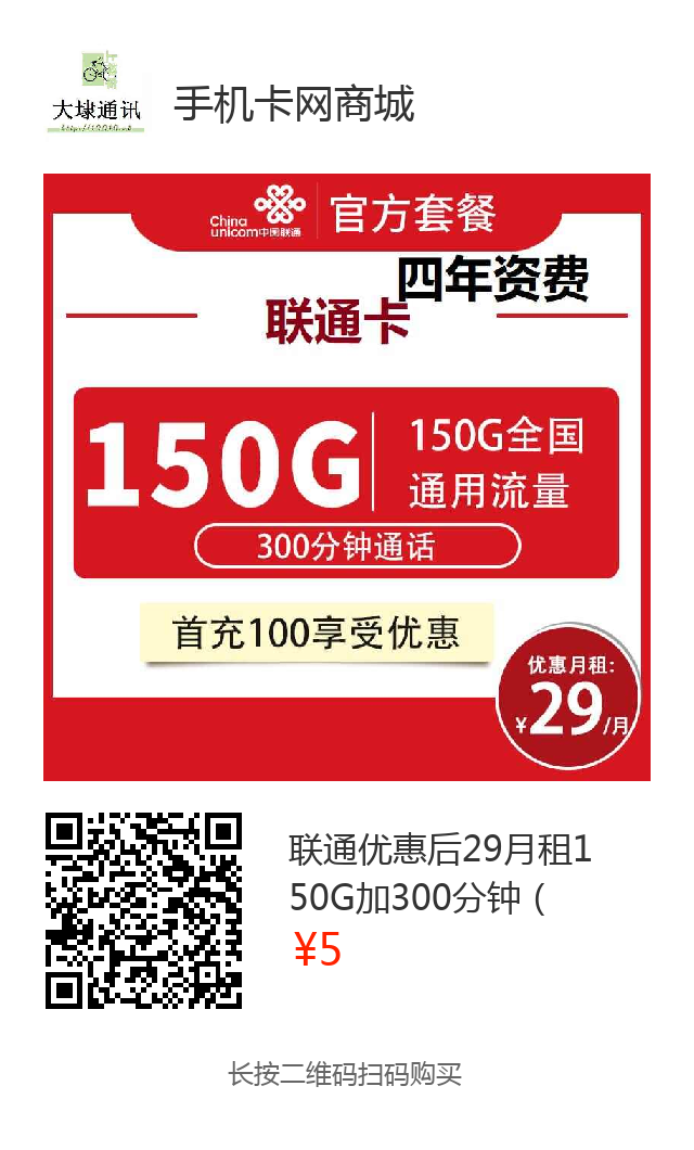 联通优惠后29月租150G加300分钟(四年资费)
