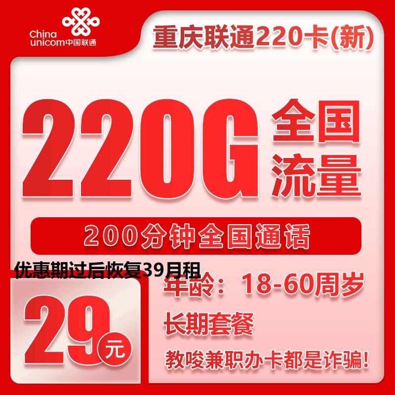 (只发重庆)联通省内优惠后29月租220G加200分钟以后长期39