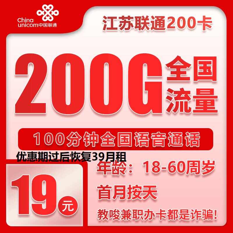 江苏联通优惠后19月租200G加100分钟以后39