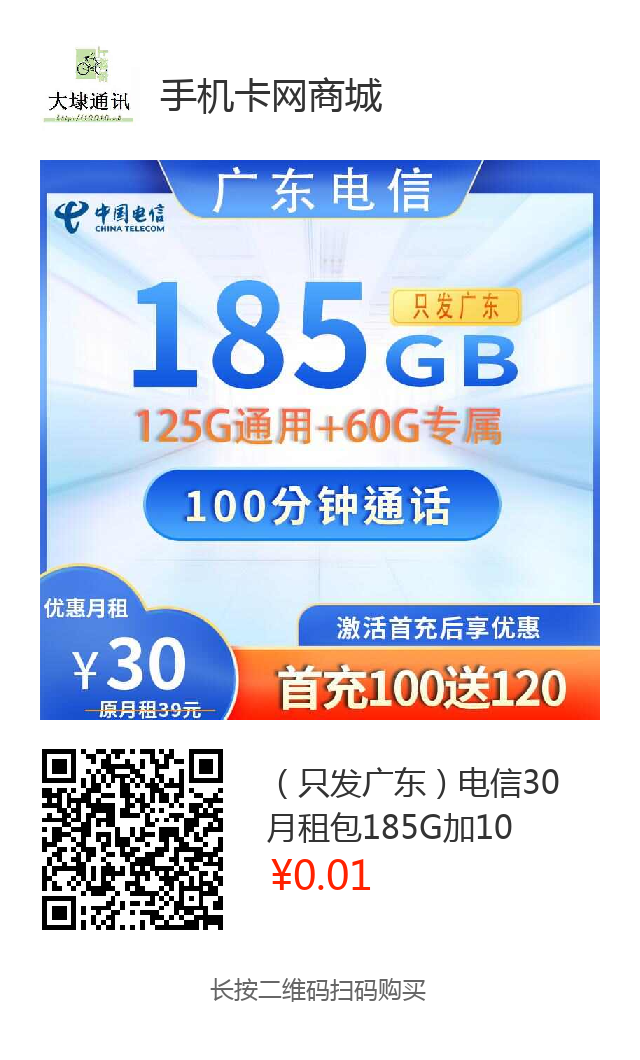 (只发广东)电信30月租包185G加100分钟(二年资费)