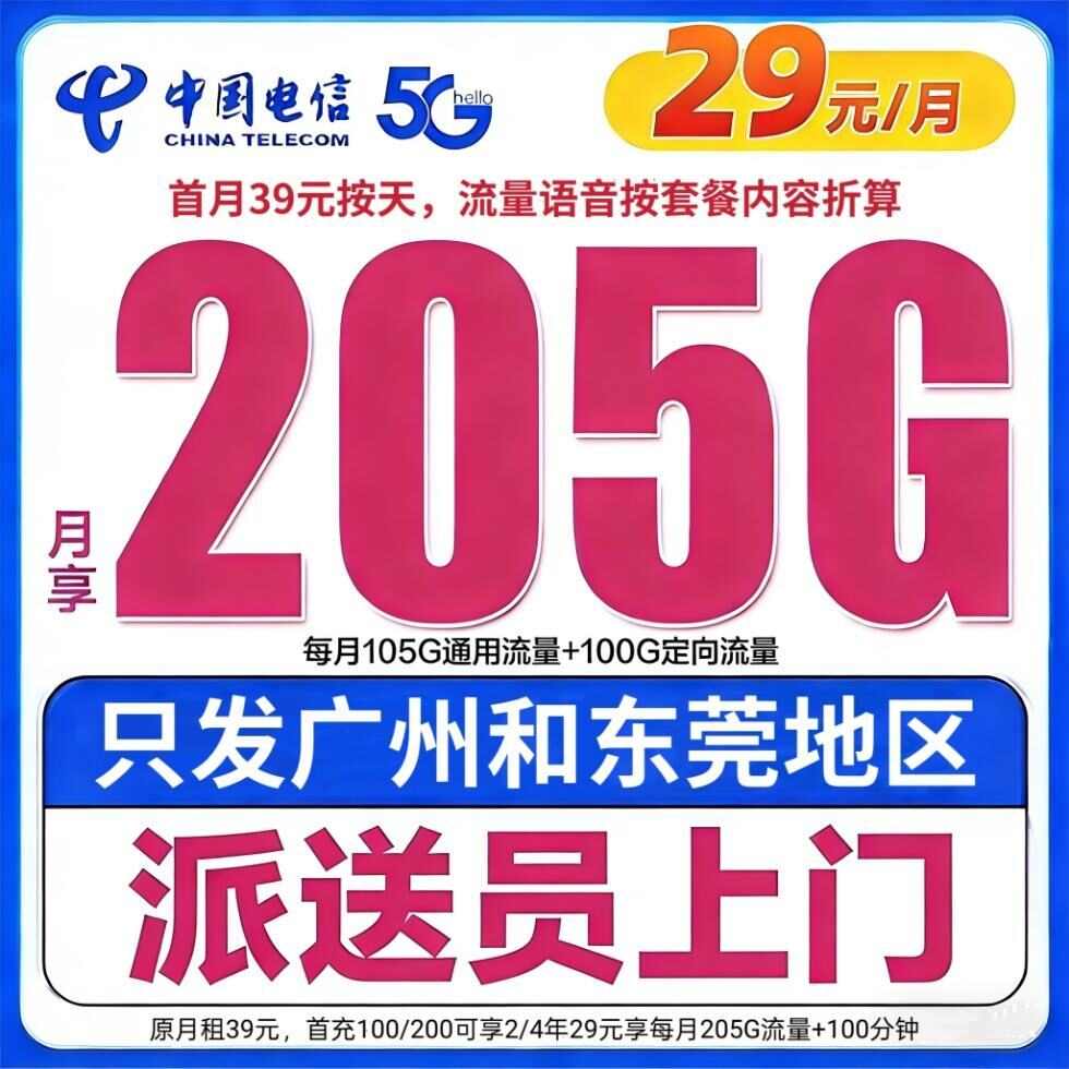 (只发广州和东莞)电信优惠后29月租205G加100分钟
